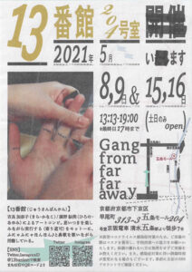 2021年5月8日(土)、9日(日)、15日(土)、16日(日)の4日間、現代アートコース卒業生の吉良加奈子さんと同じく現代アートコース卒業生の廣野鮎美さんによるアートコンビ13番館がGang from far far away(五条モール204号室)にいます。