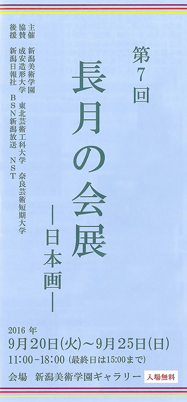 2016年9月20(火)~9月25(日)まで新潟美術学園ギャラリーにて行われる「第7回 長月の会展ー日本画ー」に西久松吉雄教授、福田浩之非常勤講師、日本画コース3年生の渡邉愛、2年生の長谷川匠が出品します。