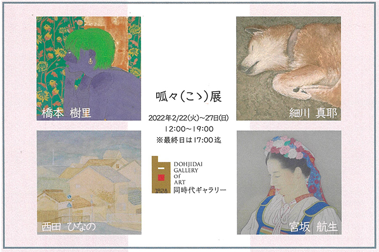 2022年2月22日(火) ~ 2月27日(日)まで、同時代ギャラリーにて行われる「呱々(こゝ)展」に、日本画コース3年生の西田ひなの、橋本樹里、細川真耶、宮坂航生が出品します。