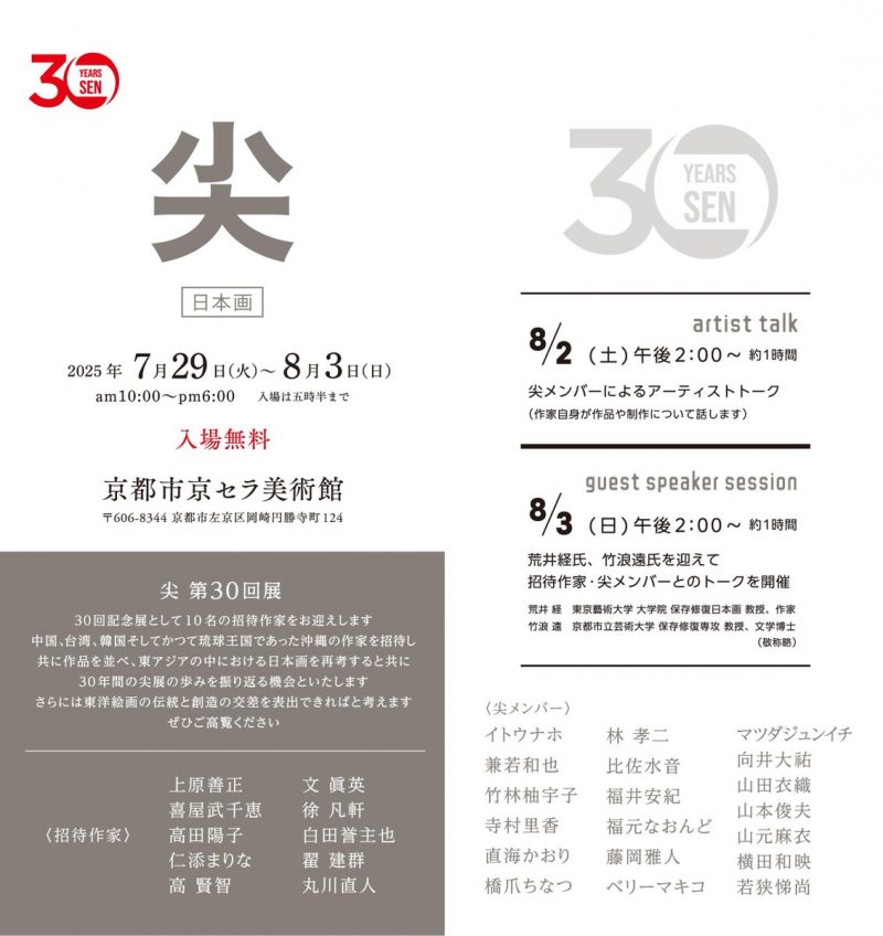 7月29日(火)~8月3日(日)まで、京都市京セラ美術館にて開催される「第30回展 尖」に、林孝二 非常勤講師、日本画クラス卒業生のベリーマキコさん、日本画コース卒業生の橋爪ちなつさんが出品されます。