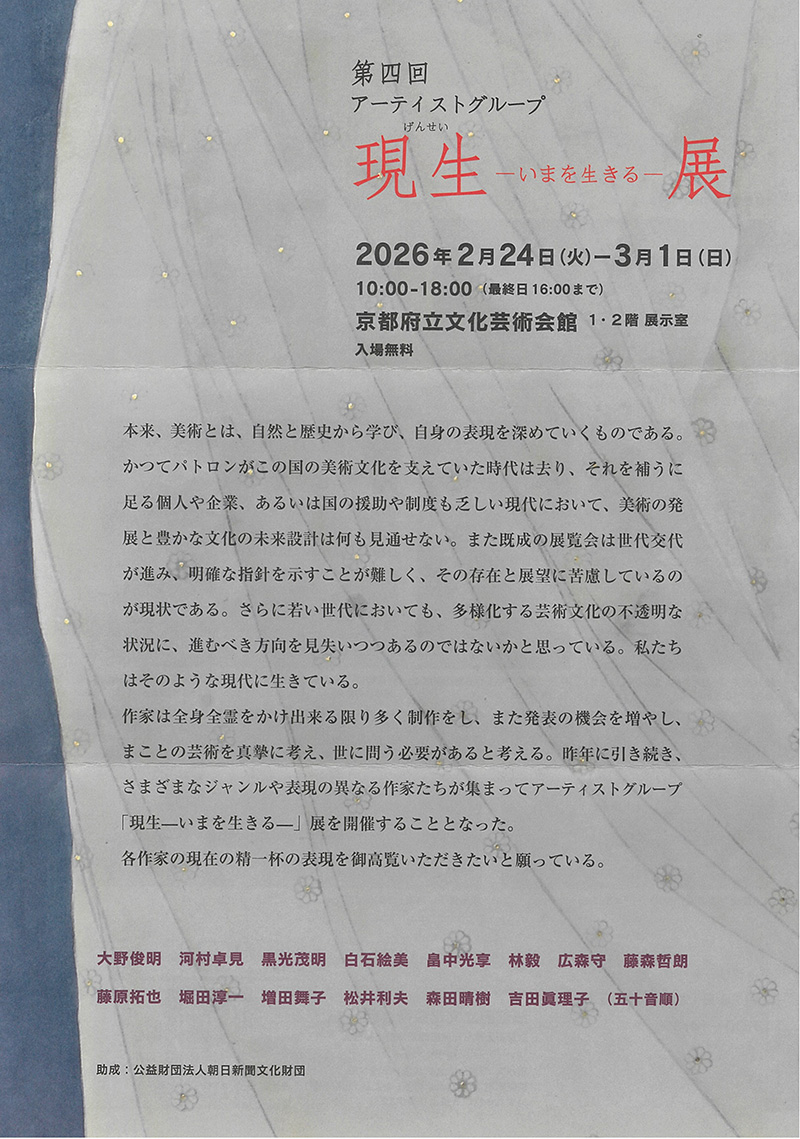 2026年2月24日(火)から3月1日(日)まで京都府立文化芸術会館にて、大野俊明 名誉教授(客員教授)が第4回アーティストグループ「現生-いまを生きる-展」に出品されます。