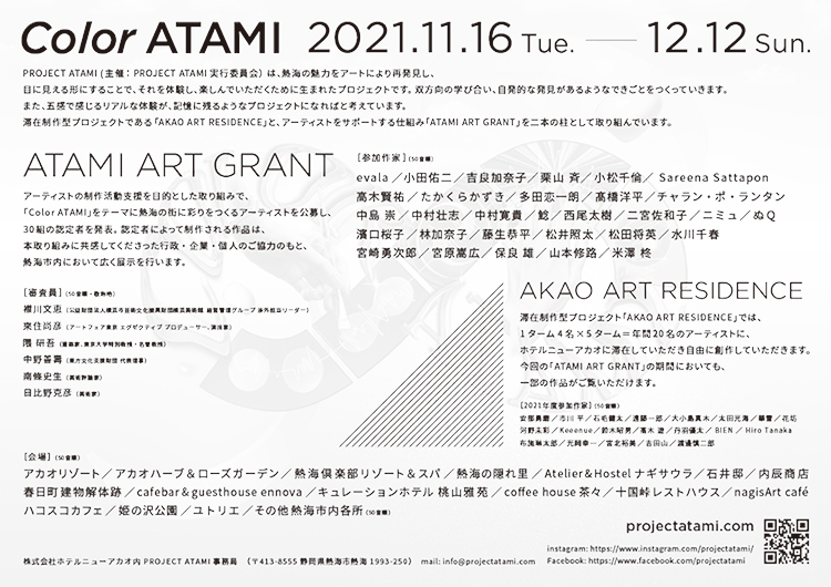 2021年11月16日(火)〜12月12日(日)まで、熱海市内を中心に24か所を会場にして開催されている「ATAMI ART GRANT」に、現代アートコース卒業生の吉良加奈子さんが出品されています。