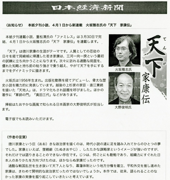大野俊明教授が挿絵を担当 日本経済新聞夕刊小説「天下家康伝」