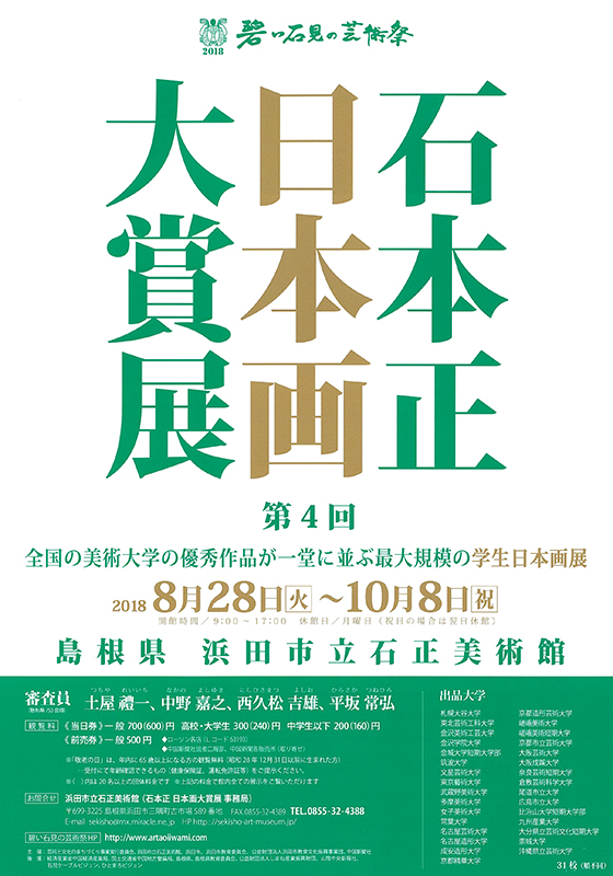 2018年8月28日(火)~10月8日(月)まで、浜田市立石正美術館にて行われる「第4回 石本正日本画大賞展」に、日本画コース 研究生の上野モモ、4年生の津田七瀬、2年生の野一色優美が出品します。