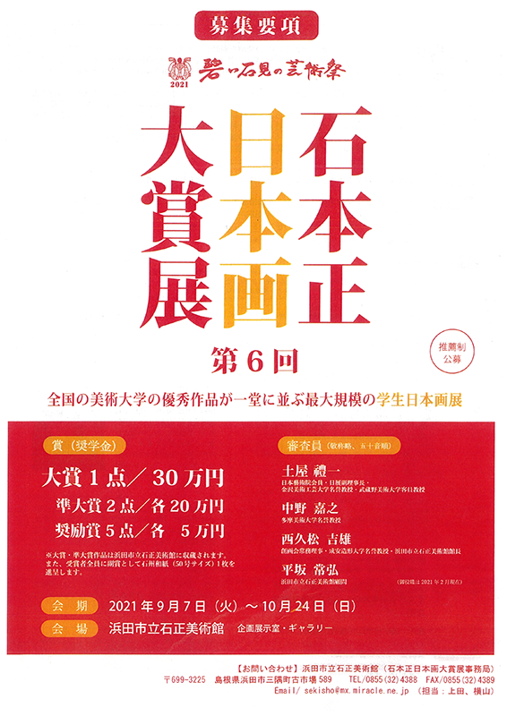 2021年9月7日(火)~10月24日(日)まで、浜田市立石正美術館にて行われる「第6回 石本正 日本画大賞展」に、日本画コース 3年生の川﨑千尋、4年生の荒木百花、研究生の田中智早希が出品しています。