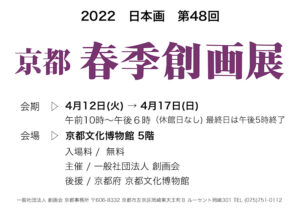 「第48回 京都春季創画展」に准教授の髙田学が春季展賞を受賞しました。また、日本画コース卒業生の岸本祥太さん、湯浅 泰将さん、日本画コース研究生修了の梶浦隼矢さんが出品され、西久松吉雄 客員教授、日本画コース研究生の野一色優美が出品します。2022年4月12日(火)~4月17日(日)まで、京都府 京都文化博物館 5階にて展示が行われます。