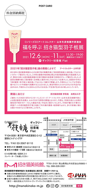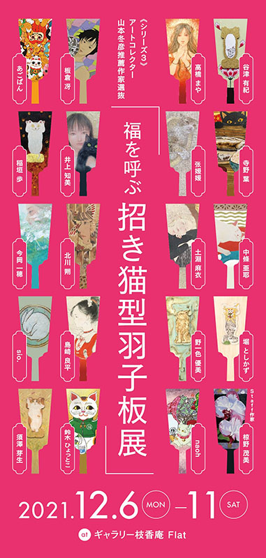 2021年12月6日(月)~11日(土)まで、ギャラリー枝香庵 Flatにて開催される「福を呼ぶ 招き猫型羽子板展」に、日本画コース卒業生の今岡一穂さんが出品され、日本画コース研究生の野一色優美が出品します。
