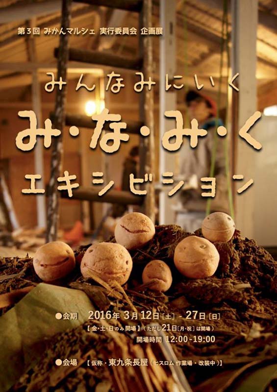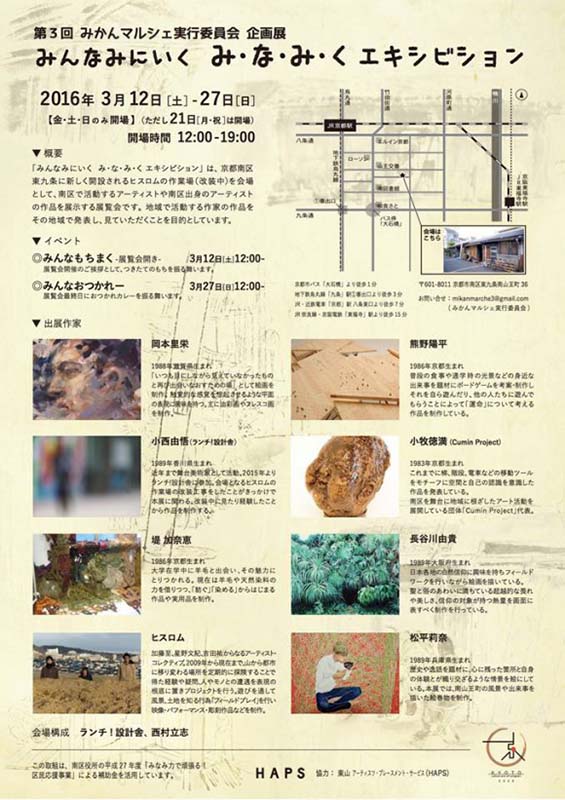 2016年3月12日(土)~3月27日(日)[※金・土・日・祝日のみ]まで、東九条長屋(ヒスロム作業場・改装中)にて行われる「みんなみにいく み・な・み・くエキシビション」に美術領域アシスタント岡本里栄が出品します。