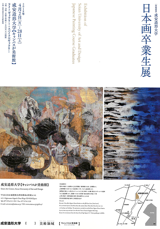 2018年4月2日(月)〜4月28日(土)まで成安造形大学【キャンパスが美術館】にて 西久松吉雄教授による「退任記念展 西久松吉雄-地のかたち」がおこなわれます。あわせて同時に開催される日本画卒業生展に、講師の高田学(日本画クラス卒業)、事務の井上雄介(日本画クラス卒業)、アシスタントの梶浦隼矢(日本画コース卒業)が出品し、日本画クラス卒業生の、寺脇さやかさん、ベリーマキコさん、丸岡未来さん、村上るみ子さん、山本雄教さん日本画コース卒業生の今岡一穂さん、宇都大志さん、清水薫さん、宮城幸佑さんが出品されます。