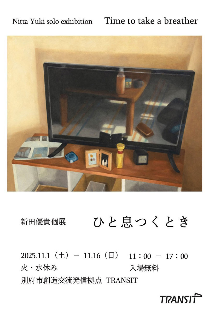 2025年11月1日(土)〜11月16日(日)まで、別府市創造交流発信拠点 TRANSITにて、洋画コース卒業生の新田優貴さんが個展「ひと息つくとき」を開催されます。