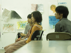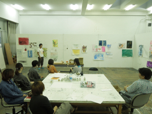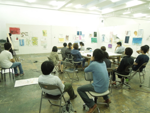 作者は前に出て作品について簡単な解説をし、みんなでディスカッションします。こうすることで自分と他者との認識のズレ、何が伝わって何が伝わっていないのかを確認していきます。今後、この授業では、版画技法を用いた表現も行う予定です。自身の主題と表現について、様々な方法や素材から、考察していくよい機会になる授業ですね。