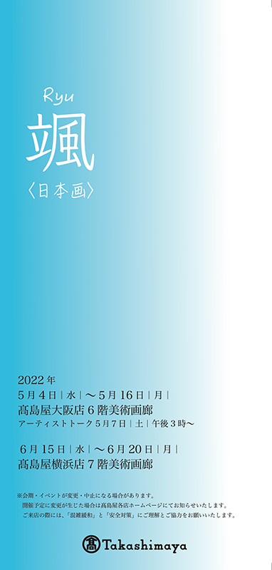 2022年5月4日(水)から16日(月)まで髙島屋大阪店、6月15日(水)から20日(月)まで髙島屋横浜店にて開催する「颯-Ryu-」に、日本画クラス卒業生のベリーマキコさん、北川安希子さん、日本画コース卒業生の今岡一穂さん、橋爪ちなつさん、研究生修了の梶浦隼矢さんが出品されます。また、日本画コース研究生の野一色優美、非常勤講師の林孝二、井手本貴子、助手の竹村花菜が出品しています。