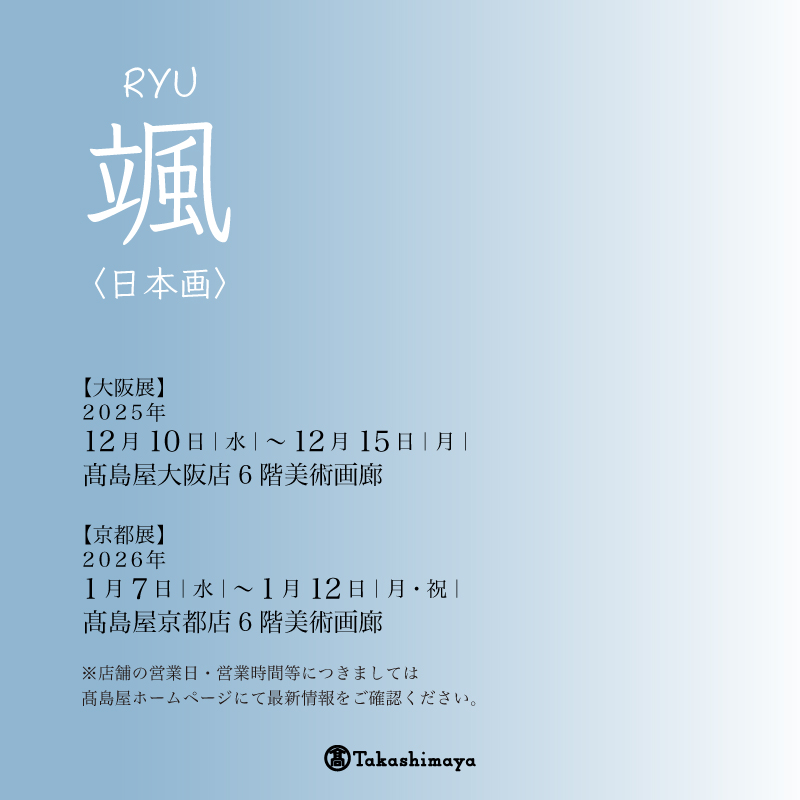 2025年12月10日(水)から15日(月)まで髙島屋大阪店、2026年1月7日(水)から12日(月)まで髙島屋京都店にて開催する「颯-Ryu-」に、日本画クラス卒業生のベリーマキコさん、北川安希子さん、日本画コース卒業生の橋爪ちなつさん、竹村花菜さん、研究生修了の梶浦隼矢さんが出品されます。また非常勤講師の林孝二、アシスタントの野一色優美が出品しています。