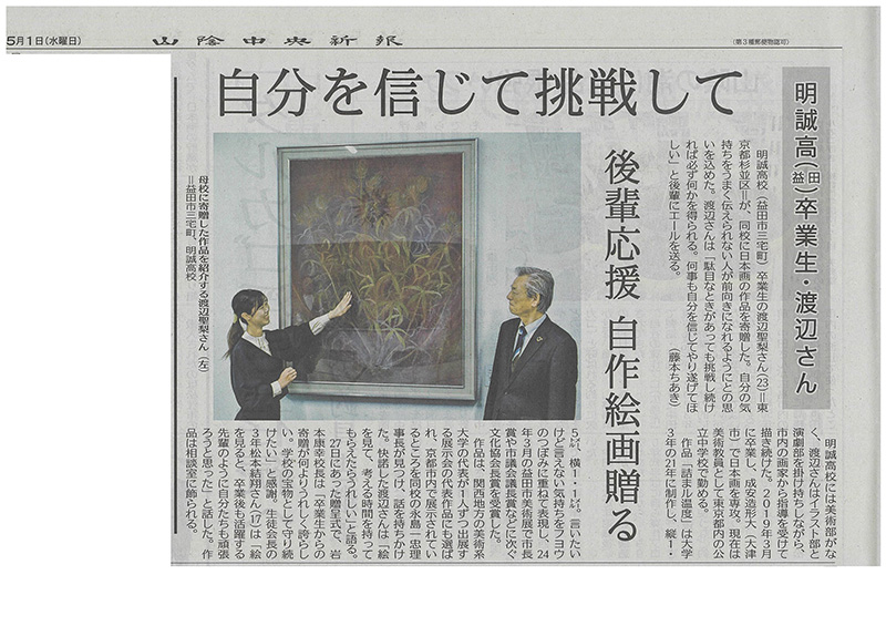日本画コース卒業生の渡辺聖梨さんの作品が母校である明誠高校に寄贈され、その様子が5月1日付けの山陰中央新報にて掲載されました。