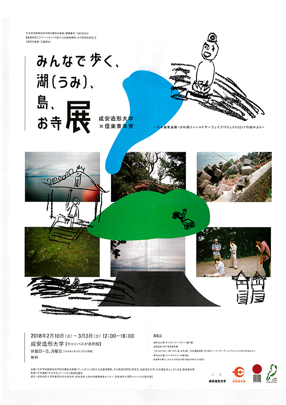 ◎「みんなで歩く、湖(うみ)、島、お寺」展は、岡田修二教授が研究分担者、馬場晋作准教授が研究協力者として携わる科学研究費助成事業「アートがつくる新たな支援者関係、その実践的研究」研究会が企画する展覧会です。