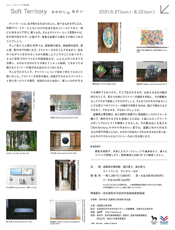 2021年6月27日(日)〜8月22日(日)まで、滋賀県立美術館にて開催されるリニューアルオープン記念展「Soft Territory かかわりのあわい」に、現代アートコース卒業生の井上裕加里さんが出品されます。