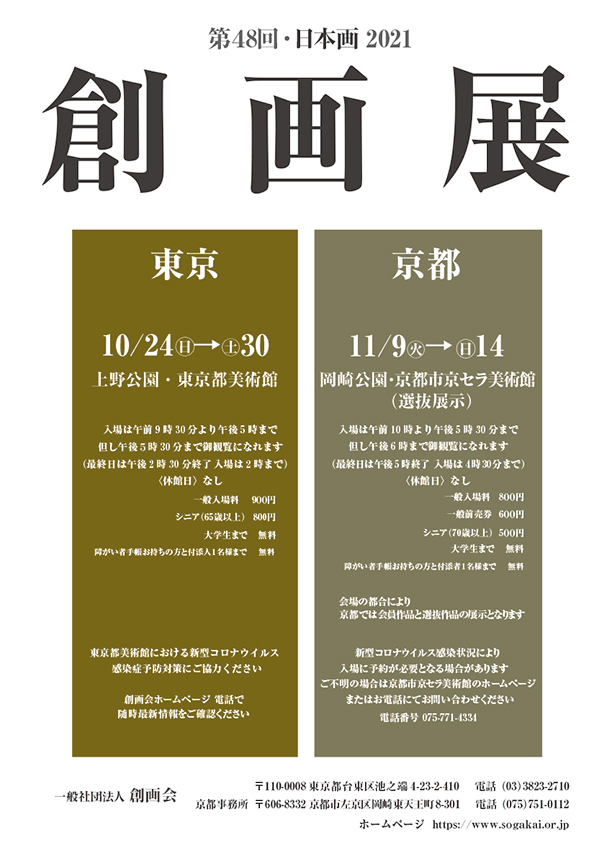 「第48回 創画展」に、日本画コース卒業生の岸本祥太さん、倉橋健さん、湯浅 泰将さん、研究生修了の梶浦隼矢さんが出品され、髙田学 准教授(日本画クラス卒)、西久松吉雄 非常勤講師、アシスタントの竹村花菜(日本画コース卒)が出品します。