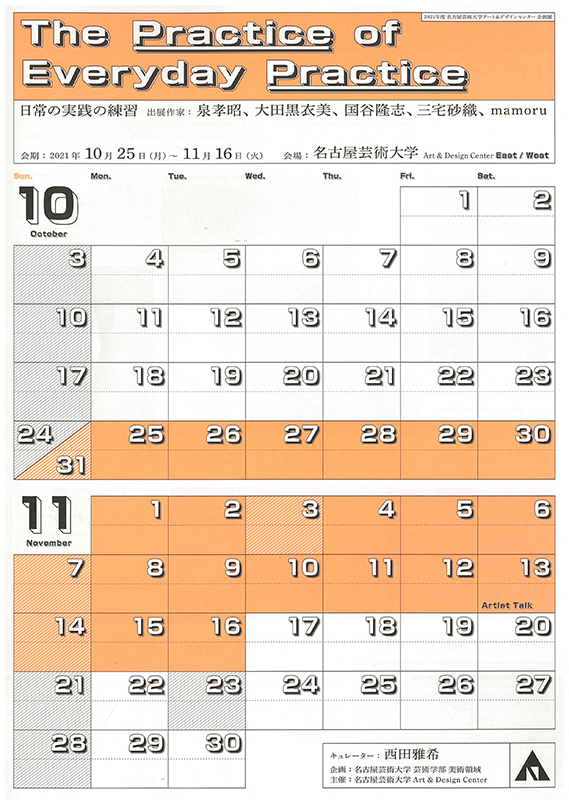 2021年10月25日(月)〜11月16日(火)まで、非常勤講師の国谷隆志(彫刻クラス卒業生)と同じく非常勤講師の三宅砂織が名古屋芸術大学にて開催される「The Practice of Everyday Practice 日常の実践の練習」に出展します。
