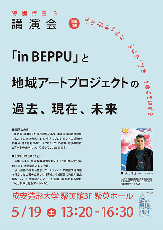 山出淳也氏の講演会を開催いたします。 BEPPU PROJECTの代表理事であり、美術領域客員准教授でもある山出淳也氏をお呼びしプロジェクトの活動の内容や、様々な地域のアートプロジェクトの紹介、今後の地域とアートの未来について語っていただきます。