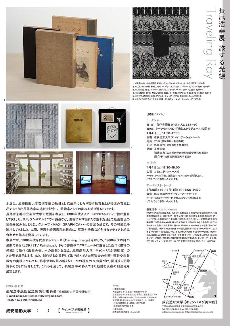 成安造形大学芸術学部の教員として30年にわたり芸術教育および後進の育成に尽力されてきた長尾浩幸教授の退任を記念し、成安造形大学【キャンパスが美術館】の2会場にて「長尾浩幸展 旅する光線 Traveling Ray」が開催されます。