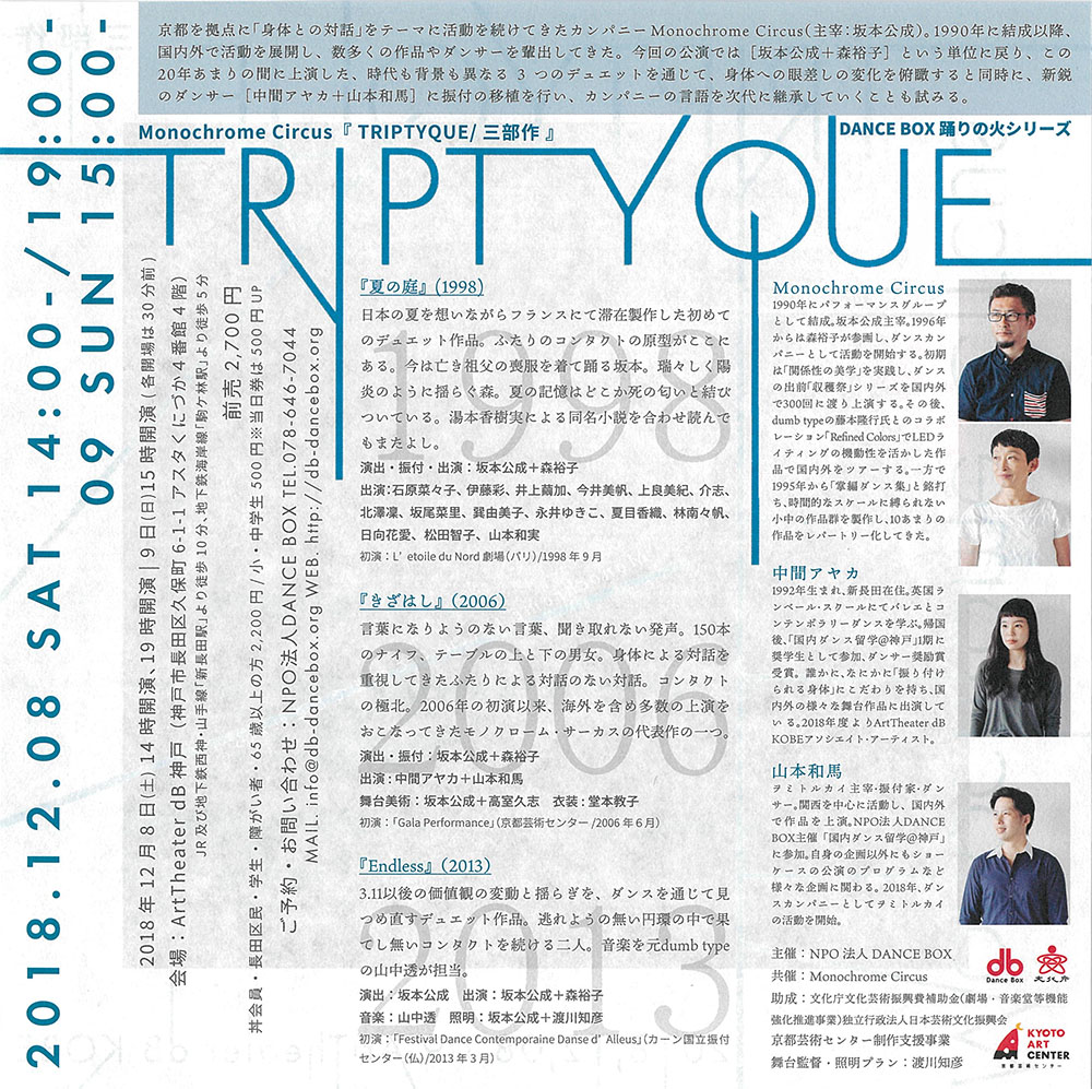 2018年12月8日(土)・9日(日)にArtTheater dB KOBEにて行われるTRIPTYQUE/三部作の「夏の庭」に現代アートコース2年生の日向花愛が出演します。