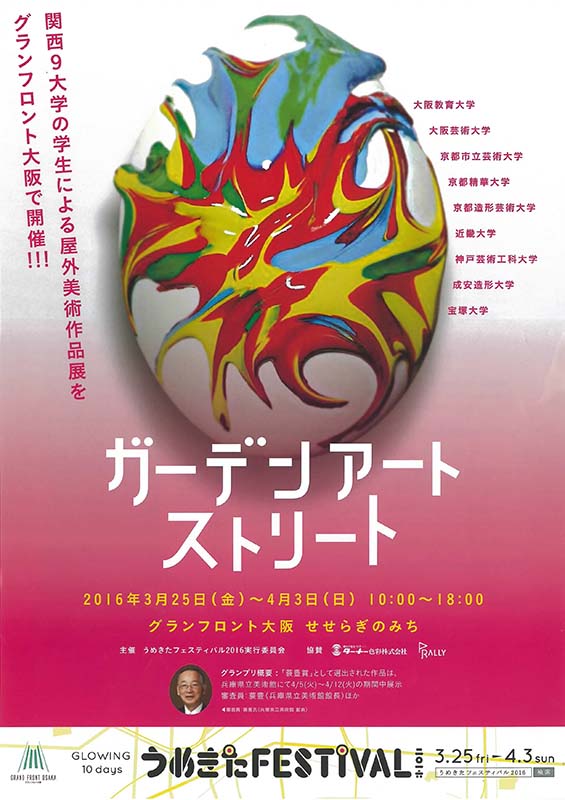 2016年3月25日(金)~4月3日(日)まで、グランフロント大阪 せせらぎのみち にて行われる「ガーデンアートストリート」に現代アートコース4年生の跡部洋と同クラス研究生の山﨑永友が出品します。