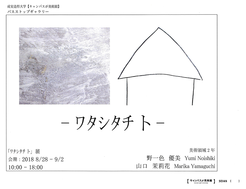 2018年8月28日(火)〜9月2日(日)まで、成安造形大学【キャンパスが美術館】バスストップギャラリーにて、日本画コース2年生の野一色優美と現代アートコース2年生の山口茉莉花がグループ展「ワタシタチ ト」を開催しています。