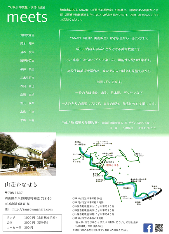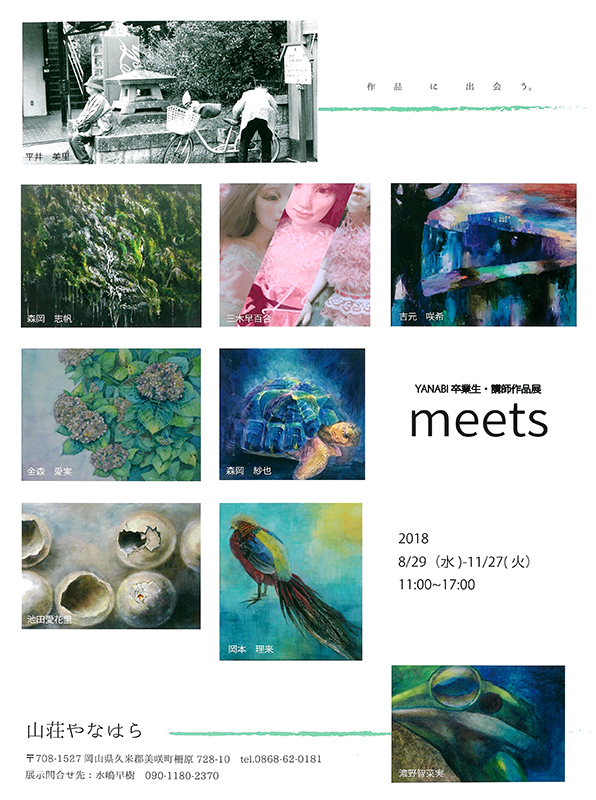 2018年8月29日(水)~11月27日(火)まで、山荘やなはら にて行われる「meets」に日本画コース3年 金森愛実、岡本理来と総合領域3年生の吉元咲希さんが出品します。
